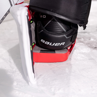 Now move in to your ready stance, drop in to your butterfly and move through a range of save selections and motions. While in your butterfly, bring your feet all the way together behind you (think Giguiere-esue saves!). In a full grown goalie or someone not leaving space to grow, your knee cap will be directly in the middle of the knee stack. For growing goalies, the knee will still be centred, but will be 1-1.5 inches below the exact middle. Ensure while standing and in the butterfly that the ankle is at the boot break and not impeded in it's range of motion.